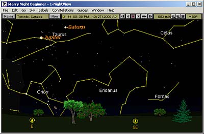 | A friend of yours mentioned that Jupiter and Saturn are close together and should be bright tonight, but you're not sure where to look. Starry Night Beginner makes it easy for you-you can look to the east and follow the 3 bright stars in Orion's belt which point straight up to Jupiter and Saturn. Click on Jupiter to zoom in for a closeup view. |