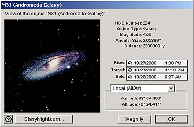 | Starry Night Beginner's detailed info window for each object shows you a picture and information such as the distance to Andromeda and the time it rises and sets. The "StarryNight.com" button allows you to search for more information on Andromeda from Starry Night's Internet database. Click to close the Info Window. |