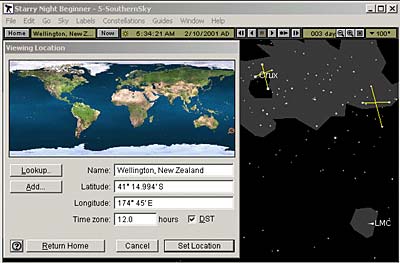 | You've heard that the closest galaxy to us isn't Andromeda, but the Large Magellanic Cloud, or the "LMC". However, you can't see this object from the Northern Hemisphere. You decide to use Starry Night to change your location to New Zealand, allowing you to locate the LMC as well as Crux, the famous Southern Cross. Click on Crux to return to your home. |