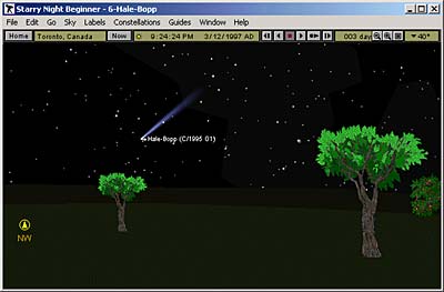 | Maybe traveling to New Zealand wasn't enough for you, and you want to travel through time as well! Starry Night makes this easy. We've gone back to early 1987 to have a look at Comet Hale-Bopp at its brightest. Click on Hale-Bopp to conclude your tour. |